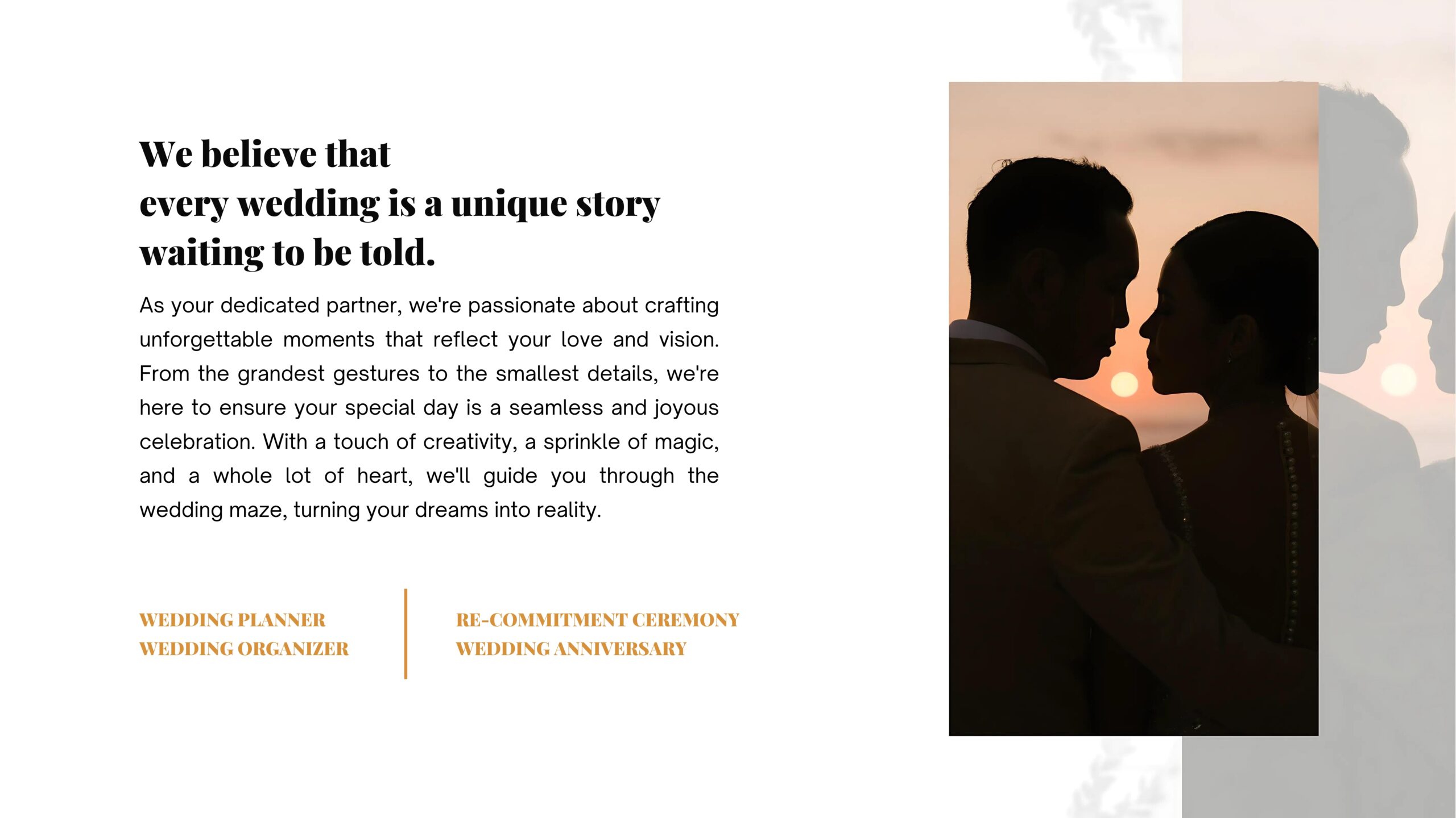 At Eventstory, we believe that every wedding is a unique story waiting to be told. As your dedicated partner, we're passionate about crafting unforgettable moments that reflect your love and vision. From the grandest gestures to the smallest details, we're here to ensure your special day is a seamless and joyous celebration. With a touch of creativity, a sprinkle of magic, and a whole lot of heart, we'll guide you through the wedding maze, turning your dreams into reality.